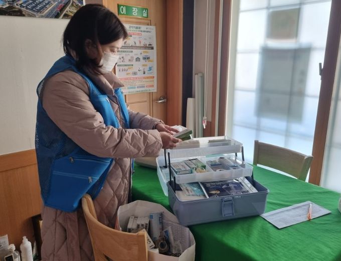 보건소 보건 업무 담당자가 직접 경로당을 방문하여 상처 연고, 해열진통제, 소독약, 붕대 등 구급함 주요 물품 25종의 유효기간을 확인하고, 유효기관이 지난 의약품은 즉시 현장에서 교체하고 부족물품도 보충한다.
