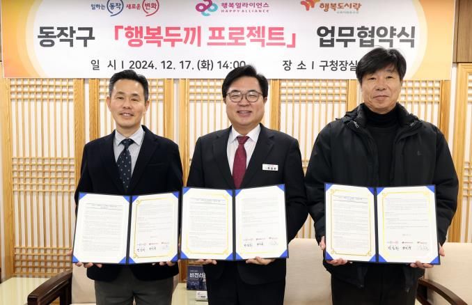 구는 지난 17일 동작구청에서 행복얼라이언스 사무국[이하 행복나래(주)], 행복도시락사회적협동조합과 ‘행복두끼 프로젝트 협력을 위한 업무협약(MOU)’을 체결했다며 이같이 밝혔다.