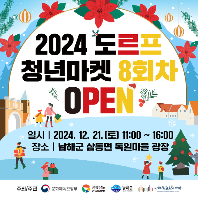 [경남도민뉴스=김부경 기자] 경남 남해군의 독일마을광장에서 올해 마지막 '도르프 청년마켓'이 오는 12월 21일 토요일에 개최된다. 이 행사는 문화체육관광부와 경상남도, 남해군, 남해군 관광문화재단이 공동으로 진행하는 계획공모형 지역관광개발사업의 일환으로 마련됐다.