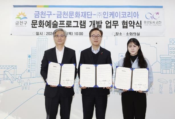 [경남도민뉴스=윤장희 기자] 금천구는 12월 19일 금천구청 9층 소회의실에서 ㈜인케이코리아, 금천문화재단과 지밸리(G밸리) 내 문화프로그램 개발을 위한 업무협약’을 체결했다고 밝혔다.