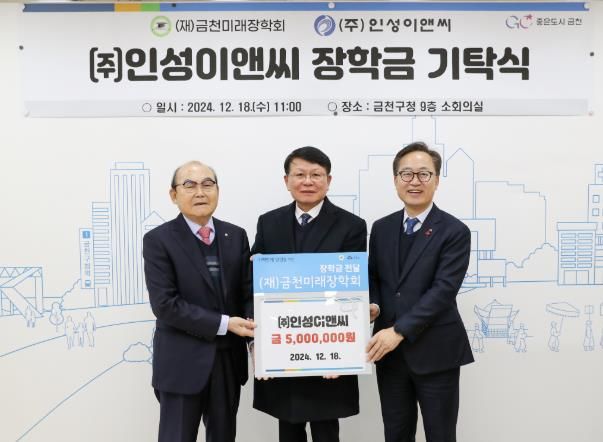 [경남도민뉴스=윤장희 기자] 금천구는 ㈜인성이앤씨에서 금천구 미래 인재 육성을 위한 장학금 500만 원을 재단법인 금천미래장학회에 기탁했다고 밝혔다.