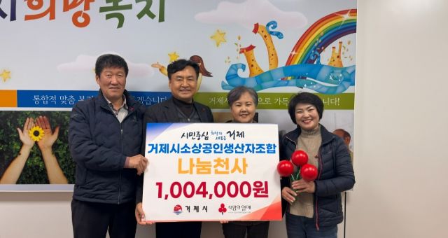 [경남도민뉴스=김부경 기자] 거제시소상공인생산자조합(조합장 안종일)에서 24일 거제시를 방문해 ‘나눔천사’1,004,000원을 거제시에 전달하며 ‘나눔천사 릴레이 기부 챌린지’를 이어갔다.