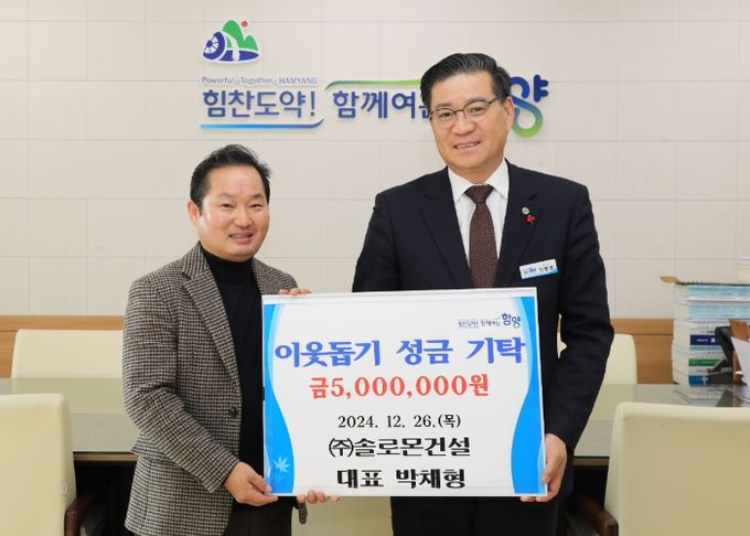 [경남도민뉴스=장광동 기자] 함양군 솔로몬건설은 12월 26일, 지역사회에 온정을 나누기 위해 이웃돕기 성금 500만 원을 기탁했다.