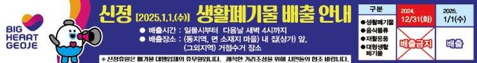[경남도민뉴스=김부경 기자] 거제시는 내년 1월 1일, 신정 휴일에는 생활폐기물 수거 대행업체의 휴무가 시행됨에 따라 일반생활·음식·재활용, 대형생활폐기물이 수거되지 않는다고 밝혔다.