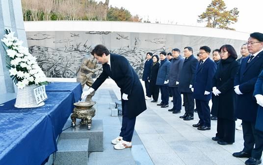 이날 참배에는 조지연 국회의원, 안문길 경산시의회 의장, 도·시의원, 보훈·안보단체장, 지역 기관장 등 100여 명이 참석해 순국선열과 호국영령을 추모하고, 최근 발생한 여객기 사고 희생자들을 애도하며 엄숙한 분위기 속에서 진행됐다.