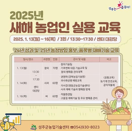 [경남도민뉴스=최민숙 기자] 성주군은 오는 13일부터 16일까지 농업기술센터 대강당에서 농업인 200여명을 대상으로 농업 조수익 1조원 달성을 위한 전문농업인 육성을 위해 ‘2025년 새해농업인실용교육’을 실시할 예정이다.