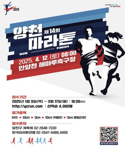 제14회 양천마라톤 대회 참가자 접수기간은 1월 9일부터 3월 17일까지이며, 양천마라톤 홈페이지를 통해 선착순으로 모집한다. 참가비는 하프, 10km, 커플런 코스는 3만 원이고, 5km, 가족런 코스는 1만 5천 원이다.