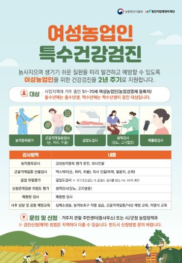 검진을 희망하는 여성농업인은 농업경영체 확인서를 지참하고 2025년 1월 22일까지 주소지 관할 읍⦁면사무소에 신청하면 된다.