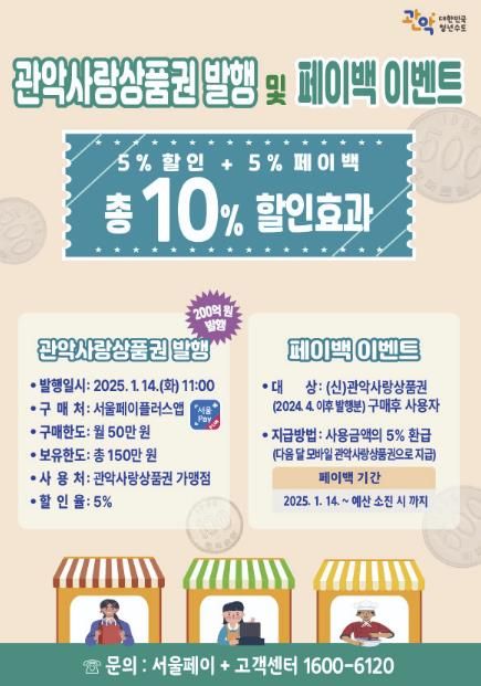 ‘관악사랑 상품권’은 서울페이플러스(서울Pay+) 앱을 통해 모바일 상품권 형태로 5% 할인된 금액으로 구매할 수 있고, 1만 654개 가맹점에서 사용 가능하다. 구매 한도는 1인 기준 월 50만 원이며, 보유 한도는 최대 150만 원이다.