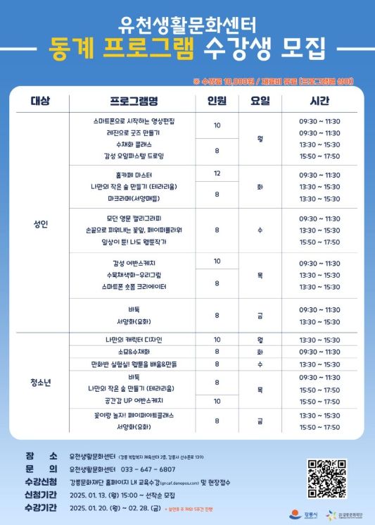 [경남도민뉴스=표재민 기자] 강릉문화재단이 오는 20일부터 5주간 운영되는 유천생활문화센터 동계 프로그램 수강생을 모집한다.