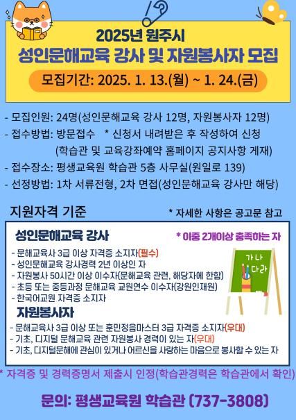 [경남도민뉴스=표재민 기자] 원주시 평생교육원 학습관은 2025년 성인문해교육 강사 및 자원봉사자를 모집한다.
