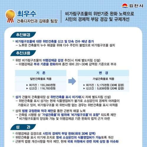 최우수에 선정된 건축디자인과 김태훈 팀장(시설 6급)은 노후화된 건축물의 누수 해결을 위해 설치한 비 가림 구조물이 위반건축물로 신고·단속되는 건수가 매년 증가하는 문제점을 개선하고자 비 가림 구조물 양성화 및 이행강제금 기준 완화를 위해 상위 법령 개정을 지속 건의했으며, 자체 이행강제금 감경을 추진해 시민의 경제적 부담 경감에 힘썼다는 평가를 받았다.