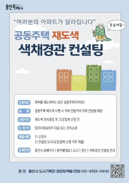 시 관계자는 “주변 환경과 어우러지는 도시 경관을 조성하기 위해 재도색을 앞둔 공동주택을 대상으로 색채 컨설팅을 제공한다”며 “공동주택 입주자들이 전문가의 조언을 얻어 쾌적한 도시미관을 가꾸는 데 동참해주기 바란다”고 말했다.