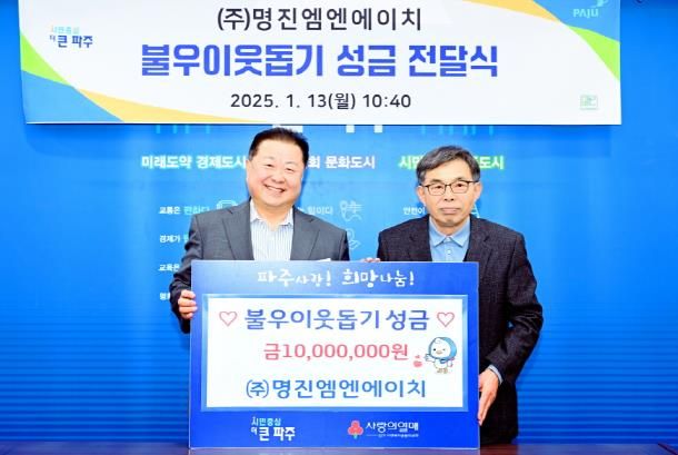 [경남도민뉴스=김미순 기자] 파주시는 지난 13일 관내 전문건설업체인 ㈜명진엠엔에이치에서 불우이웃돕기 성금 1,000만 원을 기부했다고 밝혔다.