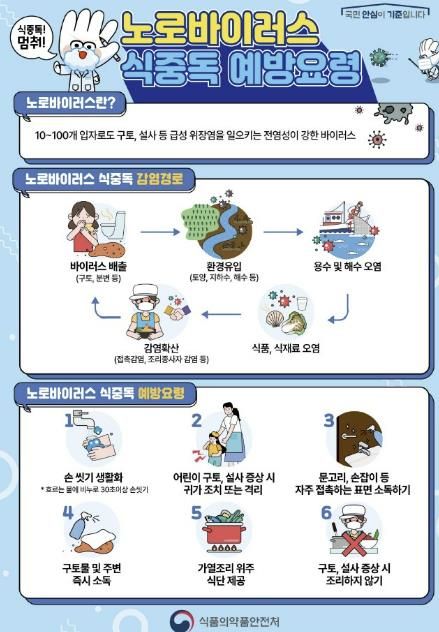 일반적으로 노로바이러스 식중독은 노로바이러스에 오염된 음식물이나 지하수를 섭취해 발생하거나 환자의 분변과 구토물, 침, 오염된 손 등 사람 간 접촉으로 전파되는 경우가 많아 조리 시 위생관리 등을 철저히 해야 한다.