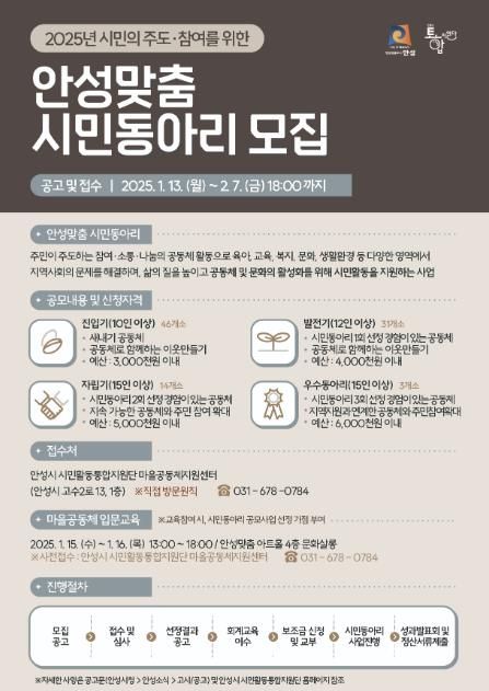[경남도민뉴스=김미순 기자] 안성시 시민활동통합지원단 마을공동체지원센터는 지난13일에 ‘2025년 주민주도·참여를 위한, 안성맞춤 시민동아리 지원 공모사업’(이하 시민동아리)을 공고했다.