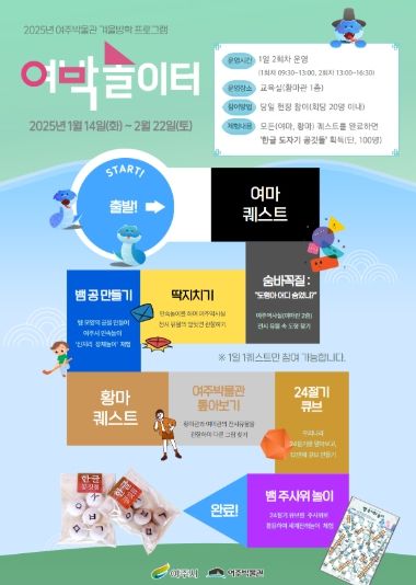 [경남도민뉴스=김미순 기자] 여주시 여주박물관은 겨울방학을 맞아 1월 14일부터 2월 22일까지 박물관 전시 유물을 색다르게 즐기고 전통문화와 놀이를 접할 수 있는 다채로운 체험프로그램을 운영한다.