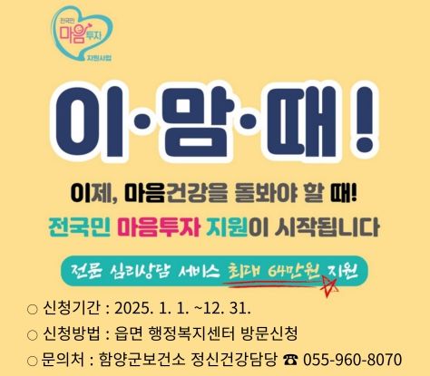 함양군보건소 관계자는 “이번 ‘전국민 마음투자 지원사업’이 단순히 심리 상담을 지원하는 차원을 넘어, 정서적 어려움으로 고립된 분들에게 새로운 삶의 전환점이 되기를 바란다”며, “군민 누구나 안심하고 도움을 받을 수 있도록 다양한 지원책을 강화하고 보다 나은 환경을 조성하는 데 최선을 다하겠다”고 말했다.