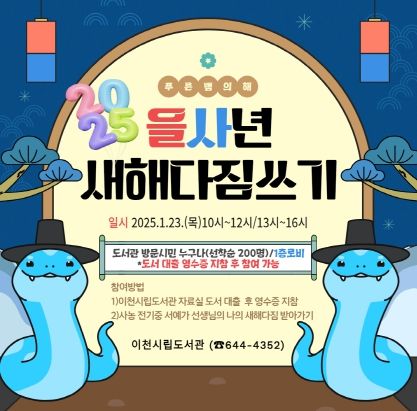 [경남도민뉴스=김미순 기자] 이천시 시립도서관은 2025년 을사년 ‘푸른 뱀의 해’를 기운차게 열고 모두의 행복을 기원하는 마음을 담아 도서관 방문 시민들을 위한 ‘새해 다짐 쓰기’ 행사를 운영한다.