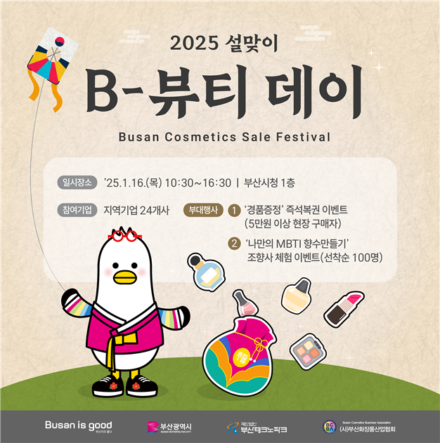[경남도민뉴스=신석주 기자] 부산시는 내일(16일) 오전 10시 30분부터 오후 4시 30분까지 시청 1층(대회의실 앞)에서 '2025 설맞이 비-뷰티(B-beauty)데이'를 개최한다고 밝혔다.