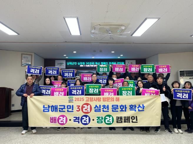 [경남도민뉴스=김부경 기자] 남해군이 ‘2025 남해군 방문의 해’를 성공적으로 추진하고 ‘국민고향 남해’ 이미지를 확고하게 다지기 위해 ‘배려·격려·장려’를 주요 골자로 한 ‘3려 캠페인’을 집중 전개한다고 밝혔다.