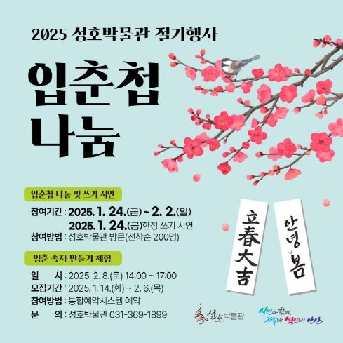 [경남도민뉴스=김미순 기자] 안산시 성호박물관은 오는 2월 3일 입춘을 맞아 시민들을 위한 입춘 맞이 행사를 개최한다고 15일 밝혔다.