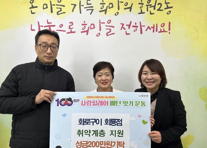 [경남도민뉴스=김미순 기자] 의정부시 호원2동주민센터는 1월 14일 화로구이 회룡점이 ‘100일간 사랑릴레이 배턴 잇기’에 동참해 성금 200만 원을 전달했다고 밝혔다.