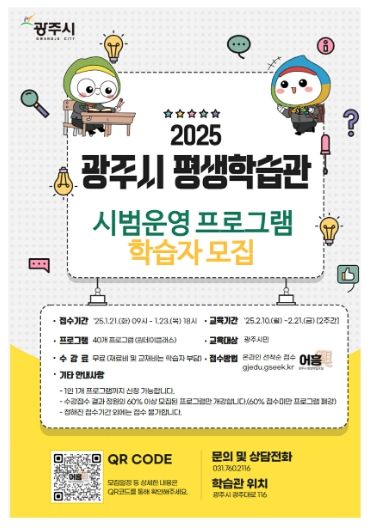 [경남도민뉴스=김미순 기자] 광주시는 오는 21일부터 23일까지 3일간 광주시 평생학습관 시범 프로그램 학습자를 모집한다고 15일 밝혔다.