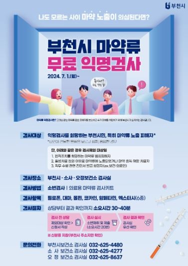 [경남도민뉴스=김미순 기자] 부천시는 타인으로 인해 마약류 노출이 의심되는 시민을 위하여 보건소에서‘마약류 6종 익명 검사’를 제공한다고 밝혔다.