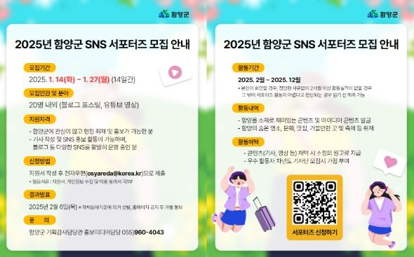 [경남도민뉴스=장광동 기자] 함양군은 군민의 눈높이에서 소통하며 군의 생생한 현장 소식을 대외에 널리 전달할 ‘2025년 함양군 SNS 서포터즈’를 모집한다.