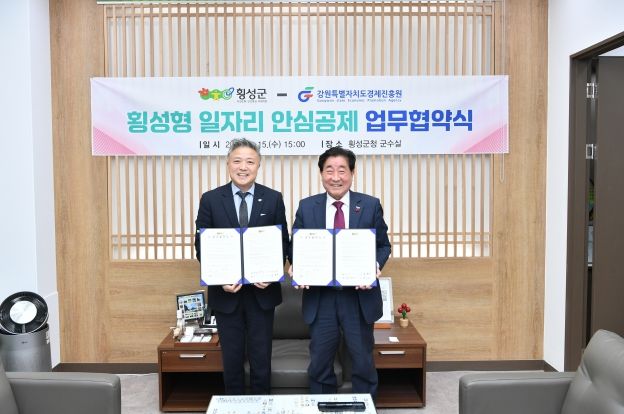 [경남도민뉴스=표재민 기자] 횡성군은 15일 오후 3시 횡성군청에서 강원특별자치도 경제진흥원과 ‘횡성형 일자리 안심공제’업무 협약을 맺고 시범사업을 추진한다.
