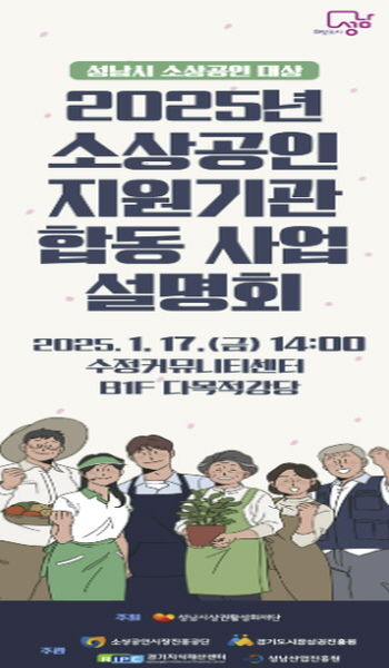 [경남도민뉴스=김미순 기자] 성남시는 오는 17일 오후 2시 수정커뮤니티센터(수정구 수진동) 지하 1층 다목적 강당에서 ‘2025년 소상공인 지원기관 합동 사업설명회’를 개최한다.