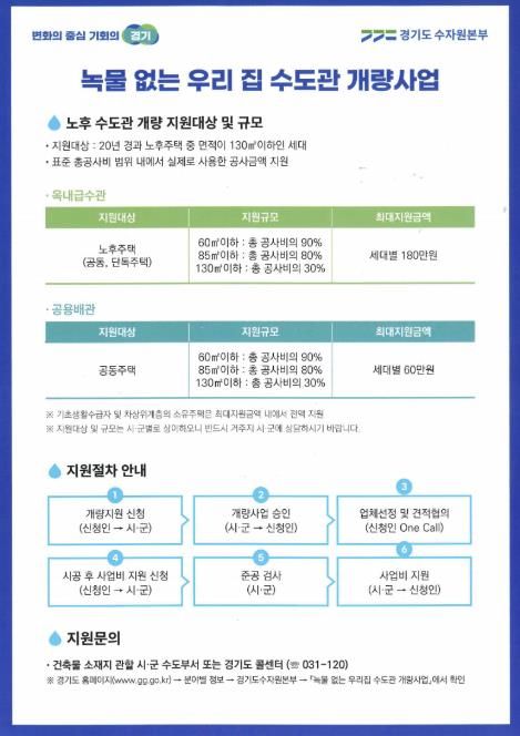 지원 항목은 △옥내급수관 교체비(최대 180만 원) △공용배관 교체비(최대 60만 원)로, 기초생활수급자와 차상위 계층 소유 주택의 경우 공사비 전액이 지원된다. 단, 최근 5년 이내에 지원받아 개량한 주택이나 재개발·재건축 승인 주택은 지원 대상에서 제외된다.