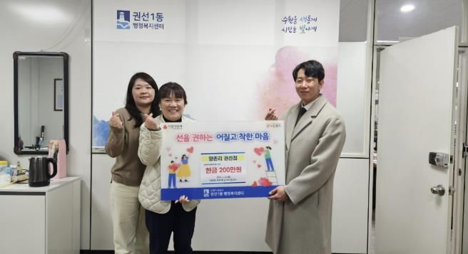 [경남도민뉴스=김미순 기자] 양촌리 권선점은 지난 13일, 권선1동 행정복지센터에 어려운 이웃을 위해 사용해 달라며 성금 200만 원을 전달했다.