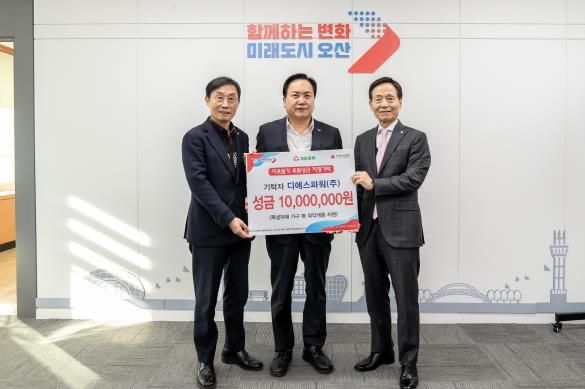 이권재 오산시장은 “항상 어려운 이웃들을 위해 나눔활동을 펼치고 있는 디에스파워(주)에 감사드린다”며 “오늘 기탁해주신 성금은 관내 어려운 이웃들을 위하여 소중하게 사용하겠다”고 답했다.