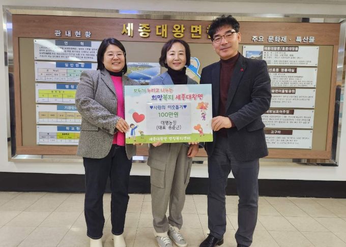 홍광래 세종대왕면장은 “수년 동안 어려운 이웃을 위해 희망과 사랑으로 나눔운동에 앞장서 주시는 마음 감사드린다.”며 “기탁해 주신 성금은 복지 지원이 필요한 위기가구를 위해 소중하게 사용하겠다.”고 전했다.