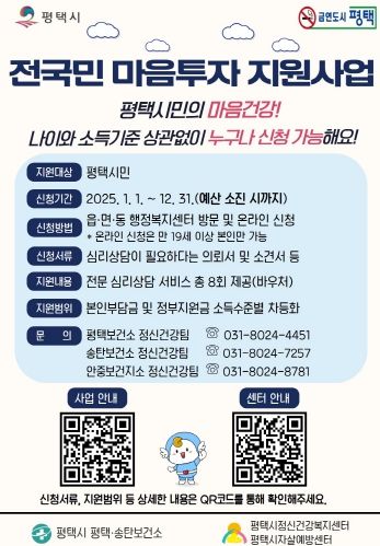 [경남도민뉴스=김미순 기자] 평택시는 시민 정신질환 예방과 마음 건강 안전망 구축을 위한 ‘전국민 마음투자 지원사업’을 지난해에 이어 올해도 운영한다고 밝혔다. 또한 서비스 제공기관인 전문심리상담센터 자격을 확대해 모집 중이다.