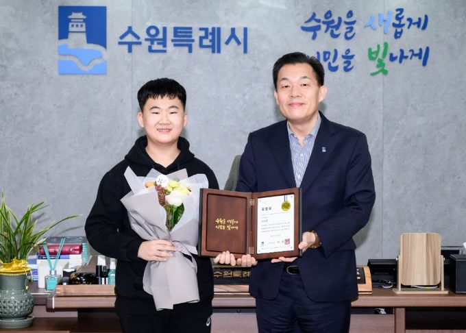 [경남도민뉴스=김미순 기자] 이재준 수원시장이 공항참사가 일어난 무안국제공항에서 최연소 자원봉사자로 활동한 전시윤(12, 수원 파장초 5학년)군에게 16일 집무실에서 수원시장 표창을 수여했다.