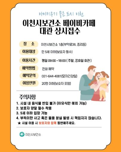 베이비카페는 이천시보건소(부악로36, 중리동) 1층 모자건강팀 옆에 있는 공간으로 가족수유실, 전자칠판, 장난감 등이 갖춰져 있어 만 5세 이하 아이들과 보호자가 함께 이용할 수 있다. 베이비카페 앞에는 휴식 공간과 동화책도 마련되어 있어 엄마와 아이가 함께 책을 보며 시간을 보낼 수 있다.