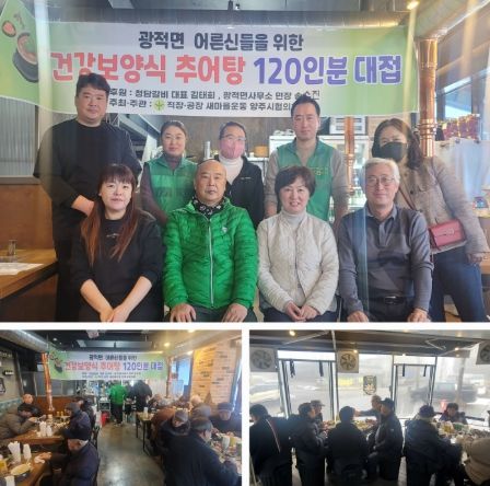 [경남도민뉴스=김미순 기자] 양주시 광적면은 지난 14일 ‘직장공장 새마을운동 양주시협의회’가 광적면 청담갈비에서 지역 어르신 120명을 대상으로 추어탕 나눔행사를 열었다고 밝혔다.
