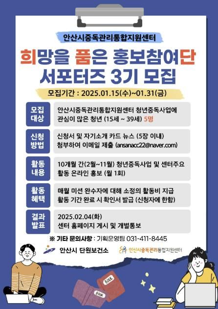 서포터즈 모집 대상은 안산시중독관리통합지원센터의 다양한 중독 관련 사업과 청년 중독 문제에 관심이 있는 15세에서 39세 사이의 청년이다. 총 5명을 모집한다.