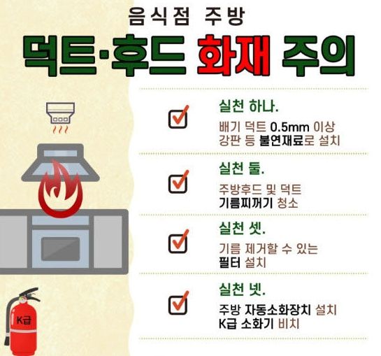 음식점 주방에서는 ▲배기 덕트는 0.5mm 이상 두께의 강판 등 불연재료 설치 ▲후드 및 덕트 기름찌꺼기 청소 ▲기름 제거에 용이한 필터 설치 ▲주방용 자동소화장치 설치 ▲K급 소화기 비치 등이 필요하다.