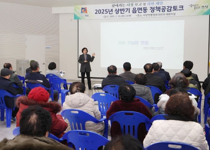 [경남도민뉴스=김미순 기자] 지난 16일 미양면행정복지센터 3층 대회의실에서 미양면 주민 80여명이 참석한 가운데, 2025년 상반기 정책공감토크가 개최됐다.