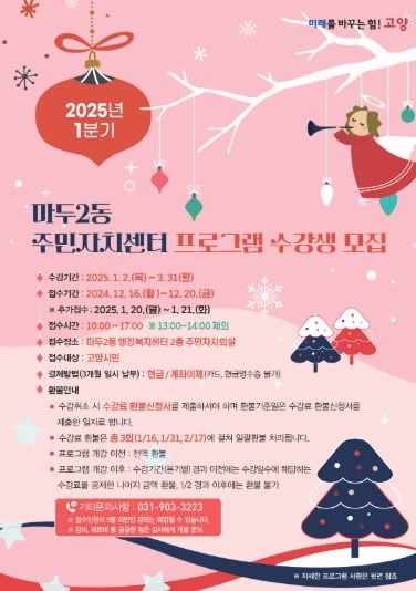 한편, 2025년 1분기 문화강좌 프로그램 일정, 수강료 등 자세한 내용은 고양시청 누리집(홈페이지) 내 마두2동 주민자치 소식에서 확인할 수 있다.