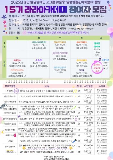 복지관 관계자는 "성인 발달장애인의 일상생활 능력 향상과 사회참여를 목표로 하는 라라아카데미에 시민들의 많은 참여를 바란다”라고 전했다.