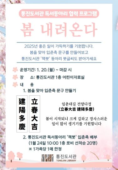 또한, 통진도서관 독서동아리 ‘책붓’에서 붓글씨로 쓴 입춘축도 1월 24일 금요일 10시부터 통진도서관 1층 로비에서 선착순 20명을 대상으로 1가족당 1매씩 배부할 예정이다. ‘책붓’은 통진도서관에서 서예를 기반으로 활동하는 독서동아리로 꾸준한 활동을 하고 있으며, 작품 전시회도 여러 번 진행했다.