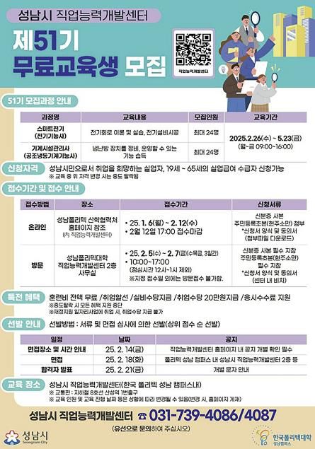 또한, 일반과정에서는 19세 이상 65세 이하의 구직 중인 성남시민을 대상으로 스마트전기와 기계시설관리사 과정의 수강생을 모집 중이다. 각 과정별로 20~24명을 선발하며, 2월 12일까지 한국폴리텍대학 성남캠퍼스 산학협력처 홈페이지에서 신청할 수 있다. 교육은 2월 26일부터 5월 23일까지 12주 동안 진행될 예정이다.