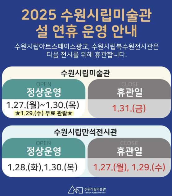 수원 화성행궁 옆에 위치한 수원시립미술관 설 연휴 기간 동안 휴관 없이 정상 운영한다. 1월 29일 설 당일은 무료입장을 실시하며 1월 31일에 대체 휴관한다.