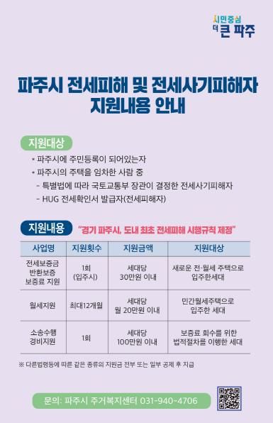 지원 대상은 파주시에 거주하는 전세사기피해자(특별법 적용)와 전세피해자(HUG 피해확인서 발급자)로, 지원 내용은 ▲전세보증금 반환보증 보증료(최대 30만 원) ▲월세(최대 12개월까지/ 월 20만 원) ▲소송수행경비(최대 100만 원) 등이다.