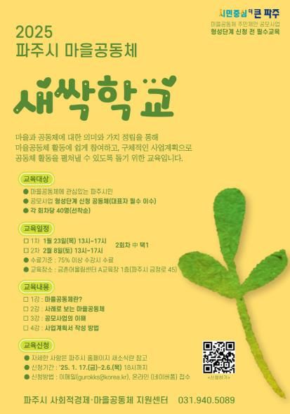 [경남도민뉴스=김미순 기자] 파주시는 오는 2월 6일까지 ‘2025 파주시 마을공동체 새싹학교’ 교육생을 모집한다.